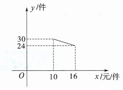 (1)设y与x的函数关系式为y=kx+b,由图知过点(10,30)和(16,24),代入得: