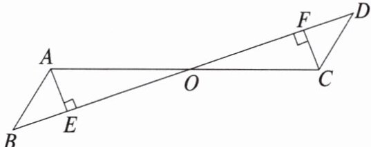 6. 如图,$ BD $,$ AC $ 相交于点 $ O $,且 $ BO = DO $,$ \angle B = \angle D $,$ AE \perp BO $,$ CF \perp DO $,垂足分别为 $ E $,$ F $。试说明该图是中心对称图形。