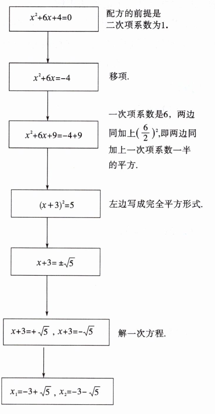 (2)我们把方程 $x^{2}+6x + 4 = 0$ 变形为 $(x + 3)^{2}=5$,它的左边是一个含有未知数的式,右边是一个常数. 这样就能应用直接开平方的方法求解. 这种解一元二次方程的方法叫作配方法. 当二次项系数为1时,配方的关键作法是在方程两边同时加的平方.