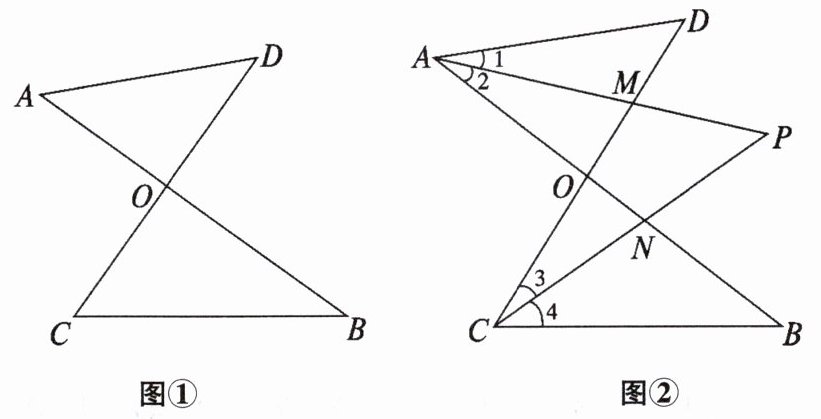 22. (10 分)如图①,线段$AB$,$CD$相交于点$O$,连接$AD$,$CB$.如图②,在图①的条件下,$\angle DAB$和$\angle BCD$的平分线$AP$和$CP$相交于点$P$,并且与$CD$,$AB$分别相交于点$M$,$N$.