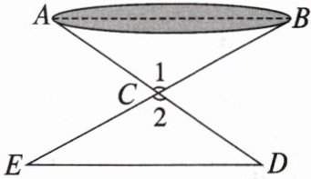 【例】一个池塘如图所示,要测池塘两侧A,B间的距离,可先在平地上取一个可以直接到达A和B的点C,连接AC并延长到D,使CD = CA,连接BC并延长到E,使CE = CB,连接DE。那么,DE的长度就是A,B间的距离。为什么?