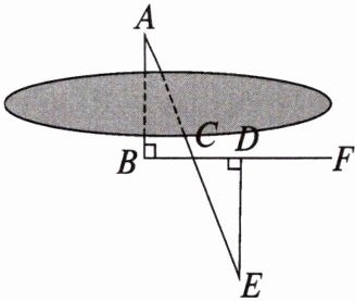 1. 如图,要测量河两岸相对的两点$A$,$B$间的距离,可以在$AB$的垂线$BF$上取两点$C$,$D$,使$BC = CD$,再定出$BF$的垂线$DE$,使点$A$,$C$,$E$在一条直线上,这时测得$DE$的长度就是$AB$的长。为什么?