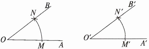 由作图可知,以点 $O'$ 为圆心、$OM$的长为半径作弧,交 $O'A'$ 于点 $M'$;以点 $M'$ 为圆心、$MN$的长为半径作弧,交前弧于点 $N'$。