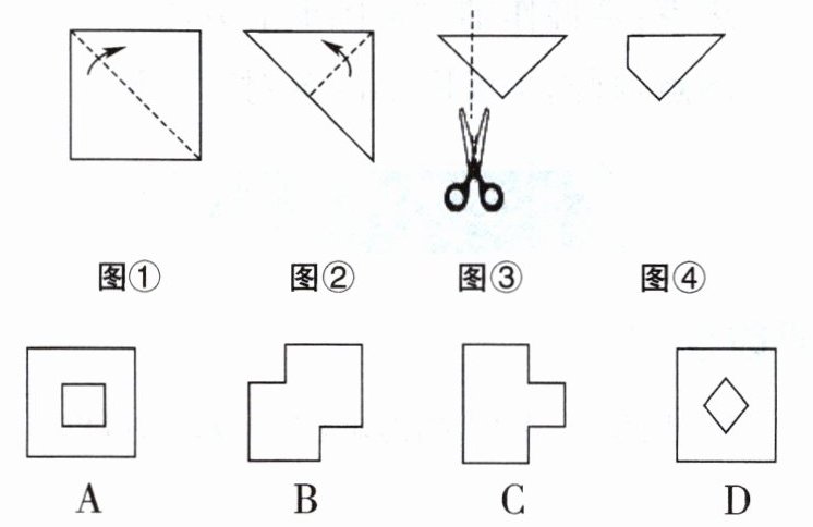 【例2】将一张正方形纸片按图①、图②所示的方向对折,然后沿图③中的虚线剪裁得到图④,将图④的纸片展开铺平,最终得到的图案是().