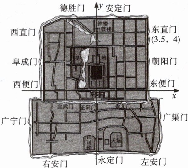 1. 西直门与东直门关于y轴对称,东直门坐标为(3.5,4),故西直门坐标为(-3.5,4)。