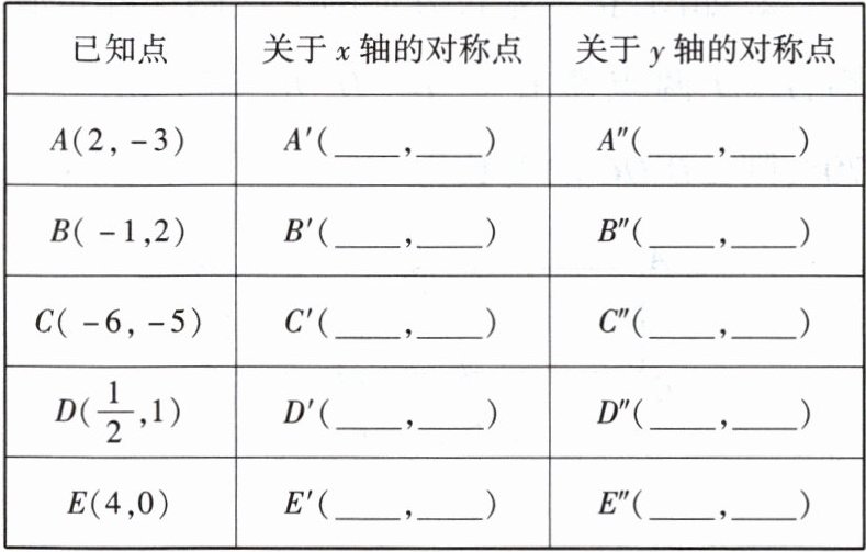2. 在平面直角坐标系中,画出下列已知点及它们关于坐标轴的对称点,并把它们的坐标填入下表中,找出每对对称点的坐标有怎样的规律.