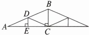 【例】屋架设计图的一部分如图所示, 点 $D$ 是斜梁 $AB$ 的中点, 立柱 $BC$, $DE$ 垂直于横梁 $AC$, $AB = 7.4\ m$, $\angle A = 30^{\circ}$. 问: 立柱 $BC$, $DE$ 的长度为多少?