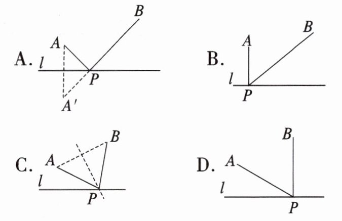 1. $A$,$B$是两个居民小区,快递公司准备在公路$l$上选取的点$P$处建一个服务中心,使$PA + PB$最小. 下列$4$种选址方案中,符合要求的是(