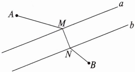 把河的两岸看成两条平行线$a$和$b$,$N$为直线$b$上的一个动点,$MN$垂直于直线$b$,交直线$a$于点$M$. 这样,上面的问题可以转化为如下问题:当点$N$在直线$b$的什么位置时,$AM + MN + NB$最小?
