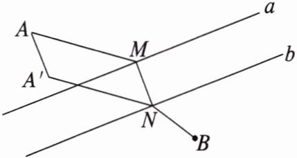 因为河宽是固定的,所以$MN$是定值,要使$AM + MN + NB$最小,只要使$AM + NB$最小. 由此,我们把$AM$沿着垂直于河岸的方向平移河宽的长度,使得点$M$和点$N$重合,如图,就转化为在直线$b$上找点$N$使得$A'N + NB$最小.