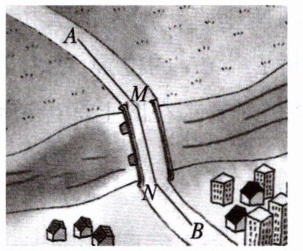 问题2:如图,$A$,$B$两地在一条河的两岸,现要在河上造一座桥$MN$. 桥造在何处可使从$A$到$B$的路径$AMNB$最短?(假定河的两岸是平行的直线,桥要与河垂直. )