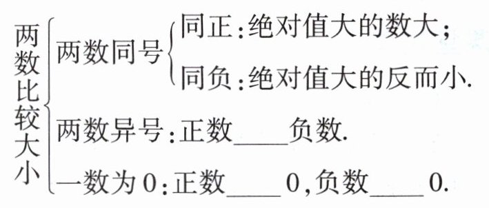 两数比较大小$\begin{cases}两数同号\begin{cases}同正:绝对值大的数大;\\同负:绝对值大的反而小.\end{cases}\\两数异号:正数$$负数.\\一数为0:正数$$0,负数$$0.\end{cases}$
