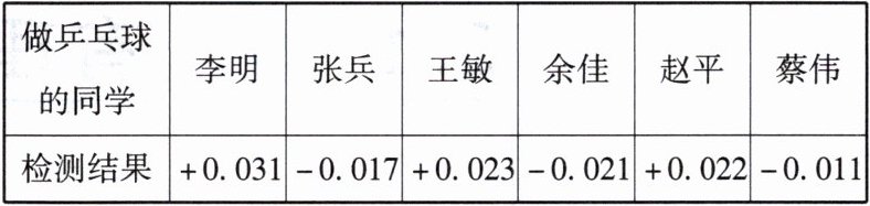 22. 在活动课上,6 名学生用橡皮泥做了 6 个乒乓球,直径可以有 0.02 毫米的误差,超过规定直径的毫米数记作正数,不足的记为负数,检查结果如下表: