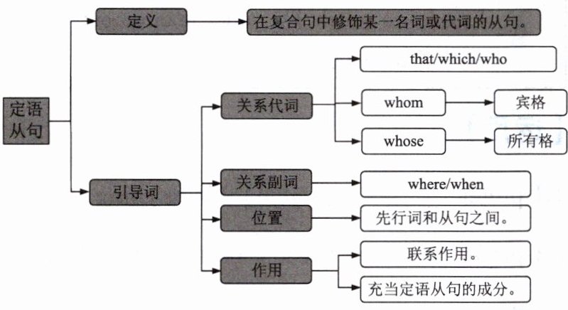1. 定语从句修饰某一名词或代词,引导词有关系代词 that, which, who, whom, whose 和关系副词 when, where 等。