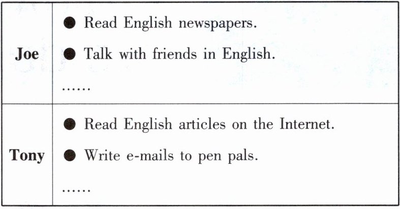 假如你叫Tony,最近你和同学Joe讨论了学习英语的方法。请根据表格提示,给你的外籍老师Mr.Miller写一封电子邮件,告诉他
