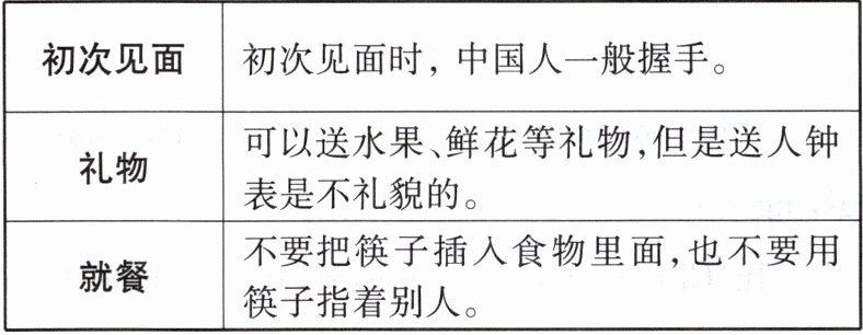 You must be excited about coming to China soon. Let me give you some advice about Chinese customs. In China you’re supposed to shake hands when you meet someone for the first time. If you are invited by a Chinese family, you can give the host some fruit or flowers. But it’s impolite to give a clock as a gift since it is considered unlucky in Chinese culture.