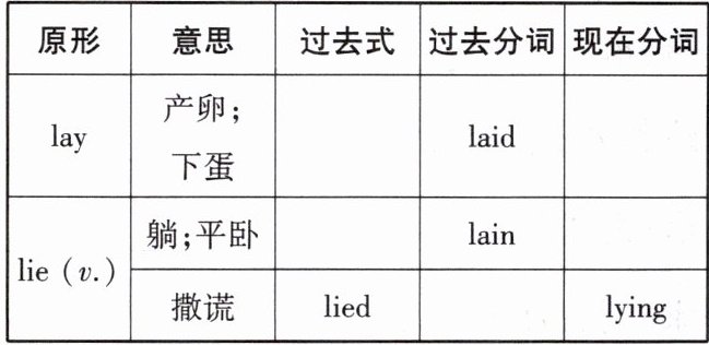 | lie (v.) | 躺;平卧 | lay | lain | lying |
