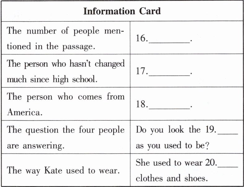16. 4/ four 17. Tom 18. Kate 19. same 20. sports