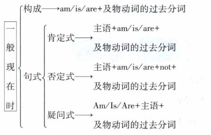 $\begin{cases}构成\longrightarrow am/is/are+及物动词的过去分词 \\\begin{cases}肯定式\longrightarrow 主语+am/is/are+及物动词的过去分词 \\否定式\longrightarrow 主语+am/is/are+not+及物动词的过去分词 \\疑问式\longrightarrow Am/Is/Are+主语+及物动词的过去分词\end{cases}\end{cases}$