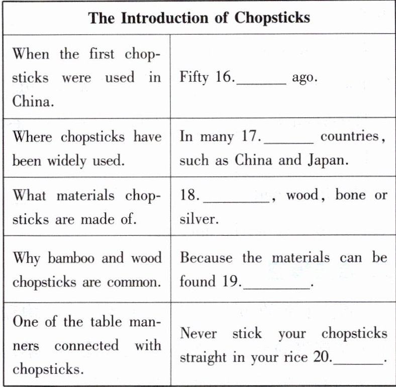 根据所听到的内容,写出可以填入下表空格处的适当单词。独白读两遍。