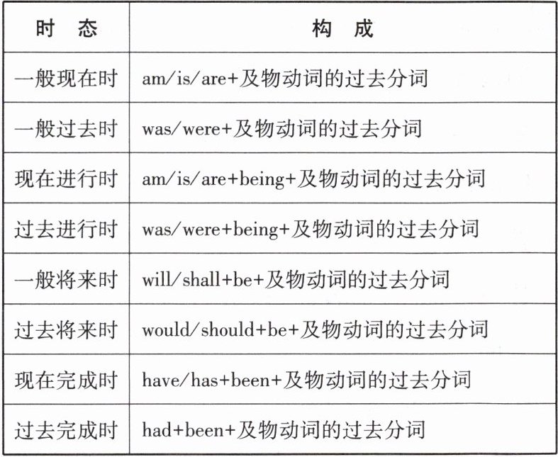 被动语态可用于多种时态。现将常用的 8 种时态的被动语态结构列表如下: