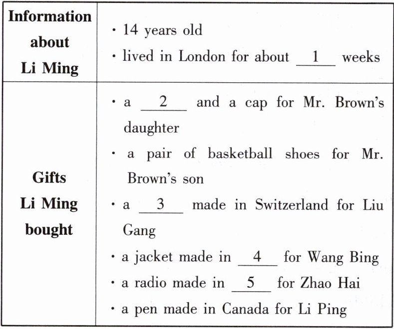 请听下面一段独白。根据所听到的内容,写出可以填入下表 1—5 空格处的适当单词,每空限填一词。独白读两遍。
