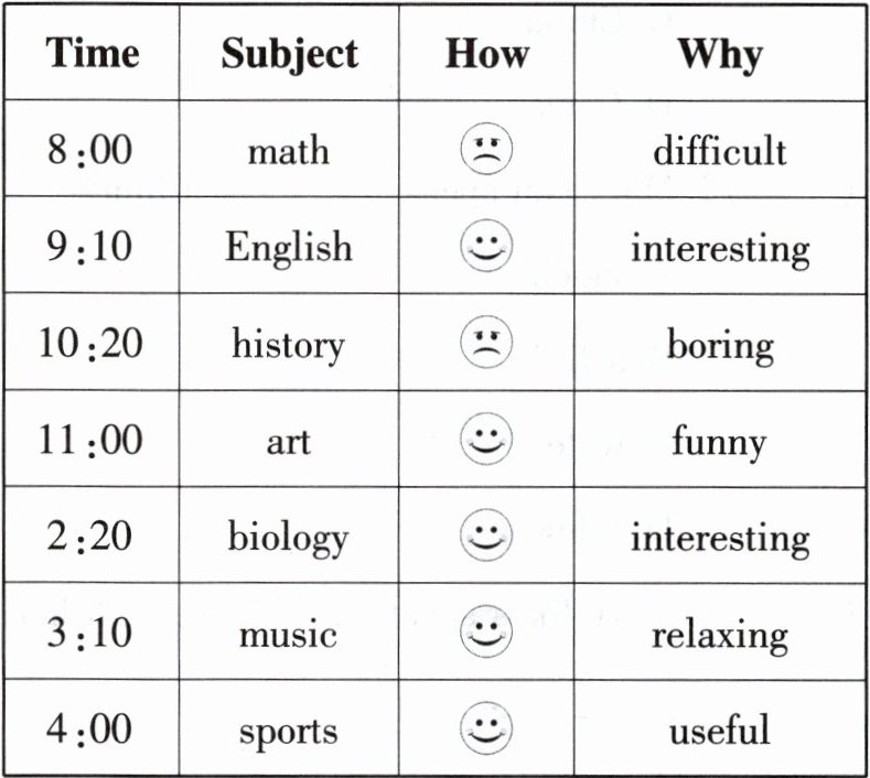 根据下面的课程表写一篇短文,向朋友们介绍你在学校一天的课程。谈谈你对各科的想法,介绍一下自己最喜欢的科目及原因。