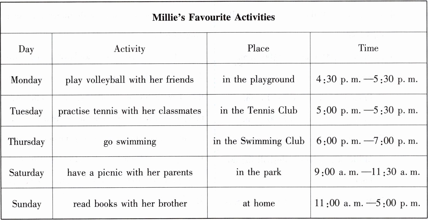 ( )3. Which of the following activity does Millie do on Thursday?