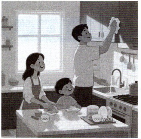 First, they think about cleaning. Jim’s dad asks him to 2 his things in his bedroom. “We should 3 the rooms well,” Dad says. “Grandma likes everything to be really clean.”