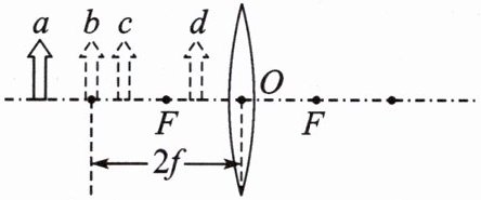 2. (透镜的应用)如图为凸透镜成像的示意图,物体可放在$a$、$b$、$c$、$d$的任一位置. 代表照相机原理的为____,代表放大镜原理的为____,代表幻灯机原理的为____.