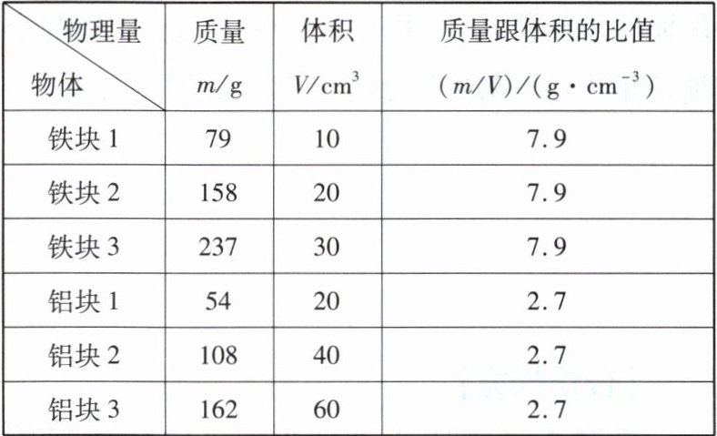 分析表中数据,我们发现:由“同种材料”组成的不同物体(如铁块1、铁块2、铁块3),尽管其质量、体积的大小各不相同,但质量和体积的比值是一定的;而不同物质,质量和体积的比值不同。可见“质量和体积的比值”仅由“物质”种类决定,它反映了该“物质”的本质特性,物理学中把它称为物质的密度。