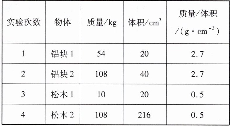 8. 为了研究物质的密度,某同学用两种不同的物质做实验,测得4组数据,填在了下表中: