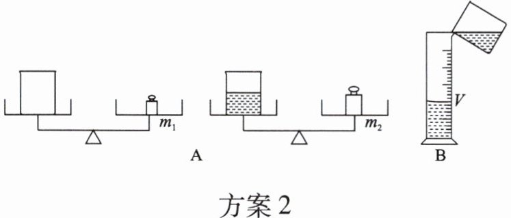 方案2:步骤:测空烧杯质量m₁→测烧杯和盐水总质量m₂→盐水倒入量筒测体积V。m=m₂-m₁,V=V。误差:烧杯内壁残留盐水,导致V偏小,由ρ=m/V得ρ偏大。