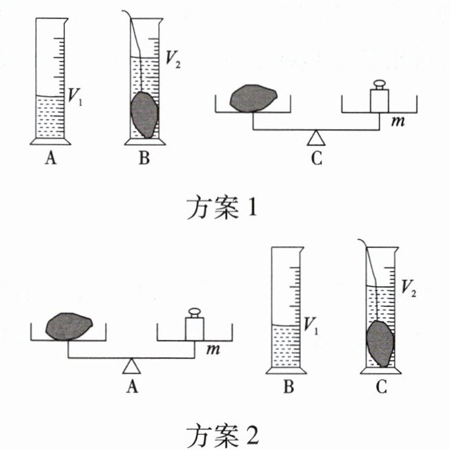 方案1:先测小石块质量m(天平测量,左物右码),再测体积V=V₂-V₁(排水法),质量测量准确,体积测量误差小,密度ρ=m/(V₂-V₁),结果准确。