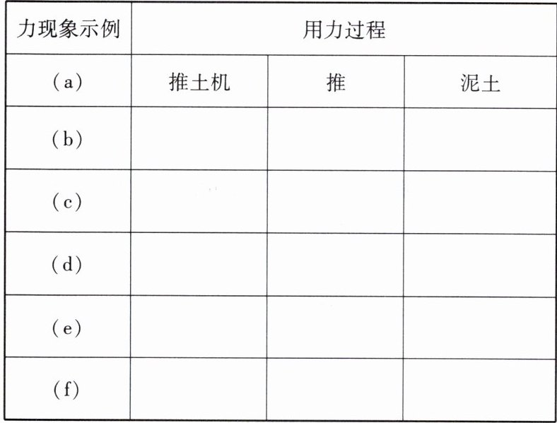 1. 观察课本第130页图6-1,将6种力现象按照示例填写在表格中: