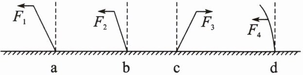 4. 如图所示,使一薄钢尺的下端固定.现分别用不同的力去推它,使其发生(a)(b)(c)(d)各图中所示的形变.如果$F_{1}=F_{3}=F_{4}>F_{2}$,那么: