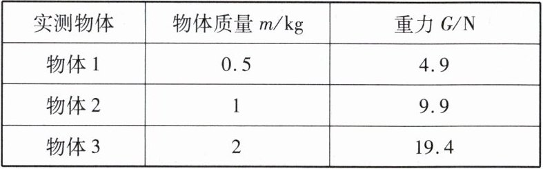 (2)根据实验测得的数据可知:物体所受重力 $ G $ 与物体质量 $ m $ 的比值为______ $ N/kg $.