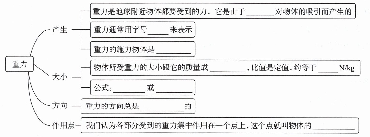 1. (必记知识)重力是______受到的力,它是______产生的,用字母______表示. 重力的施力物体是______.