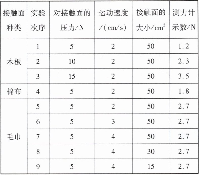 ②分析________这3次实验数据可知,滑动摩擦力的大小还与接触面的粗糙程度有关。