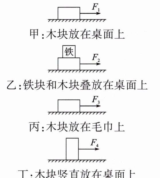 8. 如图是“研究影响滑动摩擦力大小的因素”的实验。实验得出$F_{2} > F_{1}$,$F_{3} > F_{1}$,$F_{4} = F_{1}$,有关此实验的说法中正确的是( )。
