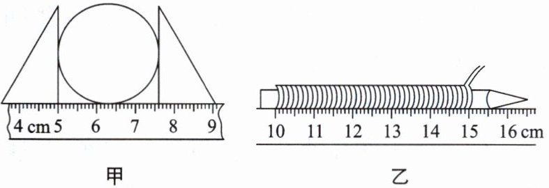 如图甲所示,1 元硬币直径的测量值是____. 如图乙所示,利用一根粗细均匀的铅笔和刻度尺来测量细铁丝的直径,线圈圈数是 32 圈,则铁丝的直径是____cm(保留两位小数).