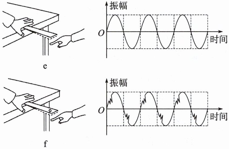 (4) 从图 e 到图 f,拨塑料尺的力不变,塑料尺伸出桌面的长度不变,在塑料尺右端开小孔,开孔前后发声的波形图像如图所示。可见结构的不同,会导致发出声音的______改变。