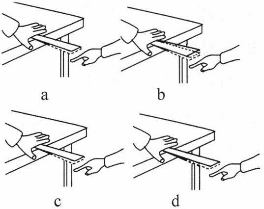 (3) 从图 c 到图 d,拨塑料尺的力不变,使塑料尺伸出桌面的长度变长,用仪器测得 c 图实验声音为 $1.3×10^{4}$,d 图实验声音为 $1.2×10^{4}$,两个数据的单位是______。可见随着塑料尺伸出桌面的长度变长,发出声音的______变小。