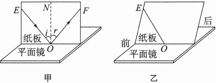 (4) 若保持平面镜水平不变,将纸板向后倾斜一个角度(如图乙),入射光线能出现在纸板上且沿EO方向入射到平面镜的O点,此时与图甲情形对比,发生改变的有( )。