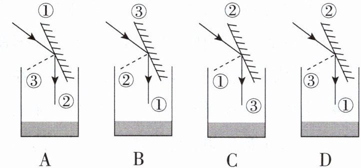 3. (光的反射定律作图)小梦想利用一块平面镜使射向井口的太阳光竖直射入井中,如图所示,图中的数字符号表示的是确定平面镜位置时作图的先后次序,其中作图过程正确的是( )。