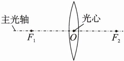 在凸透镜主光轴上,光心O左侧,距离O点与F₁到O点距离相等的位置标记黑点(即2F₁);光心O右侧,距离O点与F₂到O点距离相等的位置标记黑点(即2F₂)。