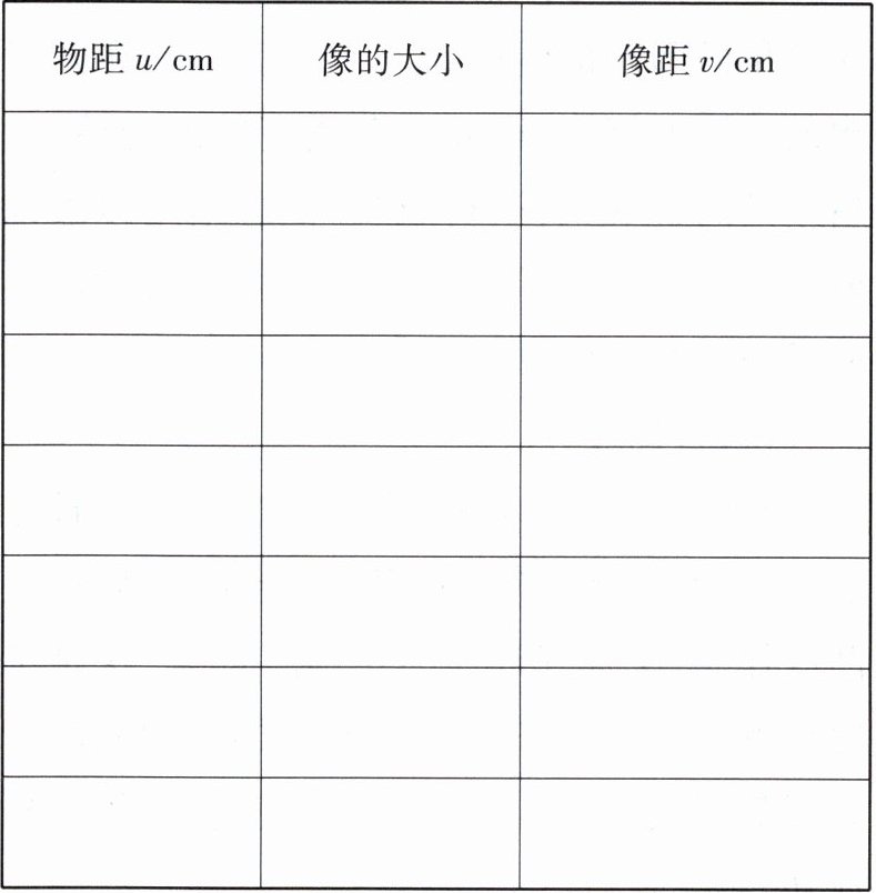 (8) 将蜡烛移到$ 10 $cm处,计算并记录物距. 移动光屏,找到像的位置,记录像的大小和像距.