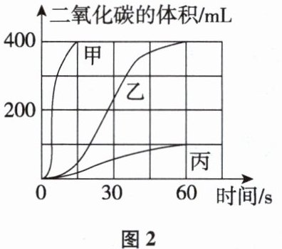 (3)选用药品。按上表进行实验,取等质量的同种大理石加入足量酸中(杂质不与酸反应),产生二氧化碳的体积随时间变化的曲线如图2所示。表中实验Ⅰ对应的图2中的曲线是____(选填“甲”“乙”或“丙”)。小组同学决定用实验Ⅱ的药品制取二氧化碳气体,不用实验Ⅲ药品制备二氧化碳的原因是____。