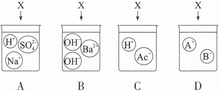 2. 下图是物质X溶于水中发生解离的微观示意图,其中能说明X是一种酸的是( )。(备注:${Ac^{-}}$为一种特殊的阴离子。)
