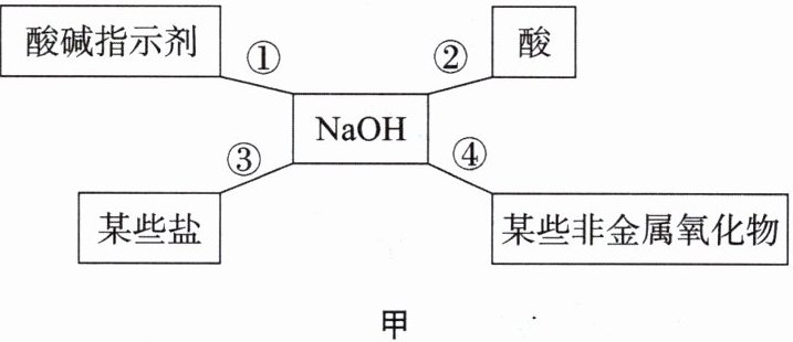 6. 归纳总结是学习化学的重要方法。小明同学用思维导图的形式总结了 $ NaOH $ 的 4 条化学性质(如图甲,即 $ NaOH $ 与 4 类物质能够发生化学反应)。请填空: